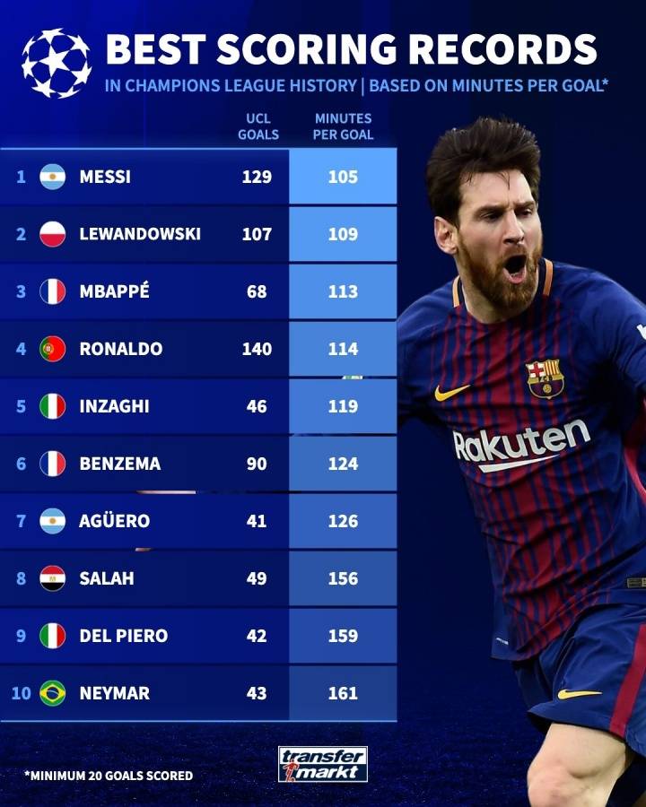 第五到第十分别是平均119分钟进1球共46球的大因扎吉、平均124分钟进1球共90球的本泽马、平均126分钟进1球共41球的阿圭罗、平均156分钟进1球共49球的萨拉赫、平均159分钟进1球共42球的皮耶罗、平均161分钟进1球共43球的内马尔。